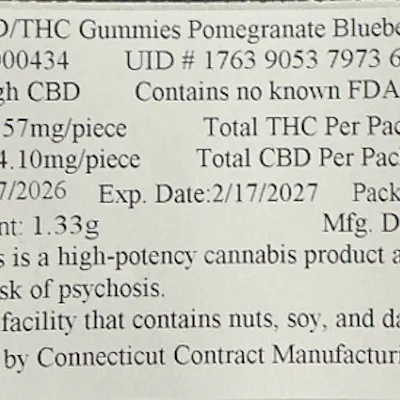 C0060000434 // Pomegranate Blueberry Acai 5:1 CBD/THC Gummies Dominance: Hybrid ----- 4.57mg THC/Gummy 24.10mg CBD/Gummy Flower Equivalent: 1.33g Expiration Date: 2/17/2027