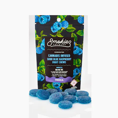 100mg Indica Gummies | Flavor: Sour Blue Raspberry Enhanced with real cannabis terpenes! Smokiez Sour Blue Raspberry Indica Fruit Chews are NOT YOUR AVERAGE FRUIT CHEWS™ ;) These fruit chews taste like fresh raspberries, but with a zing! They have a tangy taste that is reminiscent of ripe berries. These delicious fruit chews are a tasty and discreet way for you to medicate! They are also Vegan, Gluten Free, Dairy-Free, and contain NO High Fructose Corn Syrup. Each of our mouth watering fruit chews contain 10 mg of THC, and made with our high clarity cannabis distillate for great taste. There are 10 pieces per package with 100 mg active THC per package.
