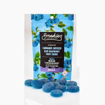 100mg Indica Gummies | Flavor: Sweet Blue Raspberry Enhanced with real cannabis terpenes! Smokiez Blue Raspberry Indica Fruit Chews are NOT YOUR AVERAGE FRUIT CHEWS™ ;) These fruit chews taste like fresh raspberries, with a juicy and slightly tangy taste that is reminiscent of ripe berries. These delicious fruit chews are a tasty and discreet way for you to medicate! They are also Vegan, Gluten Free, Dairy-Free, and contain NO High Fructose Corn Syrup. Each of our mouth watering fruit chews contain 10 mg of THC, and made with our high clarity cannabis distillate for great taste. There are 10 pieces per package with 100 mg active THC per package.