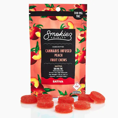 300mg Sativa Gummies | Flavor: Sweet Peach Enhanced with real cannabis terpenes! Smokiez Peach Sativa Fruit Chews are NOT YOUR AVERAGE FRUIT CHEWS™ ;) These fruit chews taste like a mesh of fresh peaches picked right off the vine! These delicious fruit chews are a tasty and discreet way for you to medicate! They are also Vegan, Gluten Free, Dairy-Free, and contain NO High Fructose Corn Syrup. Each of our mouth watering fruit chews contain 50 mg of THC, and made with our high clarity cannabis distillate for great taste. There are 6 pieces per package with 300 mg active THC per package.