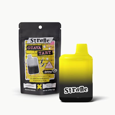 1g Hybrid Disposable Vape | Strain: Guava Tart -- Strane expertly extracts each cultivar preserving the terpenes and cannabinoids you love. Find your favorite cultivars and new drops you’ve yet to try, in high-quality oil-filled cartridges. Now available in 1 gram cartridges and disposables.