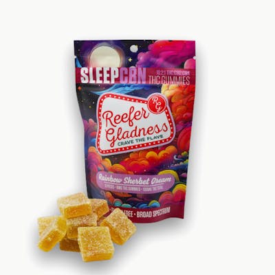 The perfect SNOOZY indica gummy blended with THC, CBD and CBN and blended with Melatonin and 5HTP (a natural amino acid) to aid in Serotonin production, mind and body relaxation and to promote and maintain deep sleep. -10:2:1 THC:CBD:CBN enhanced with Melatonin and 5HTP Available in Rainbow Sherbet and Violet Apricot Flavors to help you achieve a Good Night’s Rest. -10 pack --- Reefer Gladness Gummies are made with higher quality ingredients for an experience that’s BETTER for you… Vegan, gluten-free, & made from all natural, organic ingredients. No GMOS, preservatives, colors or artificial ingredients of any kind. BETTER Feeling: Infused with biosphere encapsulated THC + other cannabinoids for a faster-acting, elevated broad-spectrum experience – not just a THC high. BETTER Tasting: Better ingredients = Better flavor!