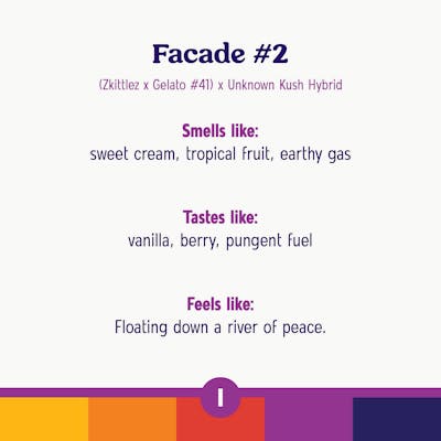 Facade #2 – Indica Lineage: (Zkittlez x Gelato #41) x Unknown Kush Hybrid Facade #2 is a balanced Indica cultivar celebrated for its bold bag appeal and layered terpene expression. Its chunky, resin-rich buds shine in deep emerald green, accented by purple streaks and fiery orange pistils beneath a heavy coat of glistening trichomes that give it a sugar-dusted look. The aroma is rich and complex, blending creamy vanilla and sweet fruit with sharp hints of earthy gas. On the palate, Facade #2 delivers a smooth mix of dessert-like sweetness and pungent fuel. Its effects strike a rare balance—uplifting the mind with euphoria while grounding the body with soothing calm—making it versatile enough for both daytime creativity and evening relaxation. Everyday Fit For… - Inspiring creative flow with a mellow edge - Sharing sweet, gassy flower in a session - Unwinding at night without losing focus Roll One 3.5g Whole Flower Roll One 3.5g Whole Flower delivers consistent, high-quality flower in a versatile size built for everyday enjoyment. Packed with trusted strains, it’s the format for rolling, packing, or sparking however you like — always fresh, always reliable. Product Highlights - 3.5 grams of single-strain flower - Smooth, flavorful, and easy to enjoy your way - A reliable choice for everyday sessions