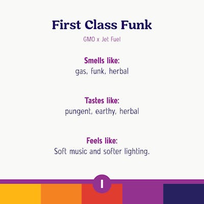 First Class Funk – Indica Lineage: GMO x Jet Fuel First Class Funk hits hard with funky, gassy buds layered in earthy spice and sweet diesel. The aroma is loud and savory, filling the air as soon as the jar cracks open. Its smoke is thick and flavorful, coating the palate with fuel-forward funk that lingers long after the exhale. As an Indica, it brings deep relaxation and a heavy body calm, perfect for late nights when the mood is easy and the vibe is set. Everyday Fit For… - Throwing on a favorite record and letting the sound take over - Passing bold smoke around at a laid-back backyard hang - Stretching out under the stars after a long day Roll One 3.5g Whole Flower Roll One 3.5g Whole Flower delivers consistent, high-quality flower in a versatile size built for everyday enjoyment. Packed with trusted strains, it’s the format for rolling, packing, or sparking however you like — always fresh, always reliable. Product Highlights - 3.5 grams of single-strain flower - Smooth, flavorful, and easy to enjoy your way - A reliable choice for everyday sessions
