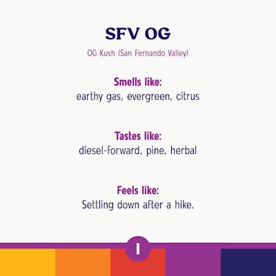 SFV OG - Indica Lineage: OG Kush (San Fernando Valley) SFV OG brings an evergreen, earthy-gassy aroma with a touch of citrus, staying true to its OG Kush roots. Flavors of diesel and pine spring forward before settling into a smooth herbal finish. Expect a steady, relaxing ride that offers a happy and clear-headed feeling with a gentle creative lift. Everyday Fit For... - Flipping through a book without rushing - Digging deeper into your favorite hobby - Calling a friend for an easy, feel-good chat Roll One 3.5g Whole Flower Roll One 3.5g Whole Flower delivers consistent, high-quality flower in a versatile size built for everyday enjoyment. Packed with trusted strains, it’s the format for rolling, packing, or sparking however you like — always fresh, always reliable. Product Highlights - 3.5 grams of single-strain flower - Smooth, flavorful, and easy to enjoy your way - A reliable choice for everyday sessions