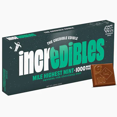 Elevation 1,056,000 ft. Things are officially out of this world with this spin on our incredibles original. 1,000mg THC, cool mint, and milk chocolatey good times. Made with pure THC distillate in a homogeneous mixture to ensure accurate dosing and consistency.