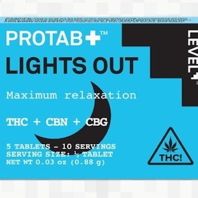 PROTAB+ A 20 mg tablet that provides effect-specific highs formulated by combining THC with additional cannabinoids and terpenoids. LIGHTS OUT™ Experience relaxation at an entirely new level and slip into a restful night’s sleep with the LEVEL Lights Out Protab+. Highly effective and long-lasting, these effects-specific tablets contain 20 mg delta-9 THC, 10 mg CBN, 3 mg CBG, with a duration of 3–6 hours. Scored to be easily split in half. Each tablet is two servings. 10 mg per serving.