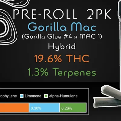 HYBRID 19.6% THC 1.3% TERPENES GORILLA GLUE X MAC #1 Gorilla Mac is a balanced hybrid created by crossing the iconic Gorilla Glue #4 with the refined, terpene-rich MAC 1. This combination delivers a smooth, approachable experience that blends earthy kush relaxation with subtle mental clarity. With over 22% total cannabinoids and a terpene profile led by caryophyllene and humulene, Gorilla Mac offers steady body calm, stress relief, and a composed, functional high. Expect flavors of earthy spice, light citrus, and herbal depth—ideal for laid-back sessions at any time of day.