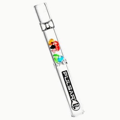 Pulsar glass chillum style hand pipes are filled with coloured glass gems that function as a natural ash catcher. Measuring about 4 inches long, these pipes feature the Pulsar logo and come with a variety of assorted gem colours.