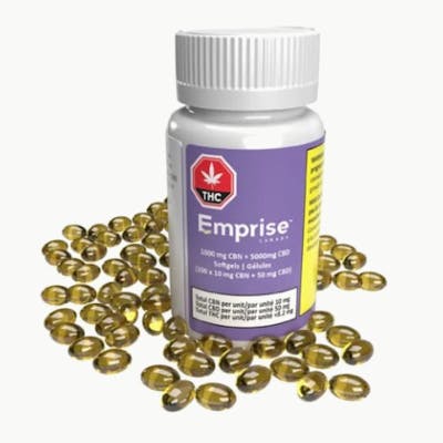 EmpriseÕs 1000 mg CBN + 5000mg CBD Softgels (100 x 10 mg CBN + 50 mg CBD) contains 100 softgels. Offering a 1:5 ratio of CBN and CBD without THC. Each softgel has 10mg CBN and 50mg CBD. The product is formulated with no-THC extracts and hemp seed carrier oil. Each bottle contains 100 softgels (Total 1000mg CBN and 5000mg CBD).