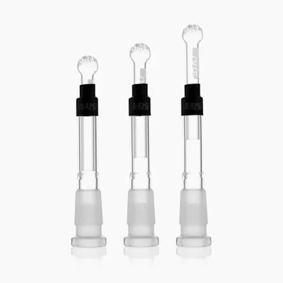 The 14mm GRAV® Adjustable Downstem can extend anywhere from 4" to 6" and is compatible with any 14mm beaker or straight-based water pipe with an angled joint. The two halves of the downstem are held together by a custom fitted segment of heat shrink tubing. Its tri-cut showerhead diffuses smoke through water, and its adjustable length is perfect for any amount of water. It fits into a 19mm joint and receives a 14mm bowl or banger. Joint: 14mm Male Joint Length: 23 mm Main material: Borosilicate Glass Use with: Flower Width: 23 mm