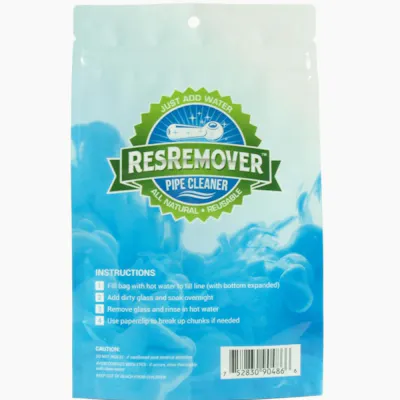 ResRemover 420 Cleaner is the first "Just Add Water" pipe cleaner! Simply add hot water to the bag, add your dirty smoking accessories, and soak overnight. All-natural plant-based formula is safe on the environment, no more alcohol or other harsh solvents! Since ResRemover is water-based it rinses completely clean after use, there are no bad tastes, smells, or residues from other traditional cleaning chemicals. Say goodbye to isopropyl alcohol and other harsh solvents, salts, and abrasives. No agitation is required. The cleaning pouch can be stored by closing the zip seal top and storing it with other household cleaners. Safe on glass, quartz, acrylic, plastic, silicone, metal, and ceramic. To use: Fill with HOT water to the fill line, add dirty items, squeeze out air to raise water level if needed and zip seal the bag, soak overnight. After soaking rinse under hot water. Seal bag for reuse if desired. *Pro tip* For larger items that don't fit in the bag, soak stems and bowls following the directions above, then pour the remaining contents of the bag into a larger glass from the top and let soak.