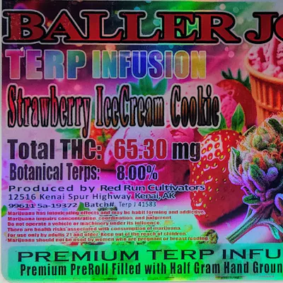 Introducing Red Run Baller Joints – Strawberry Ice Cream Cookie Terp Infusion – a premium .5 gram terpene-infused pre-roll, delivering a potent and flavorful cannabis experience - perfectly rolled for an even, slow burn Benefits: Rich Strawberry Ice Cream Cookie Flavor – sweet and fruity with a smooth finish. Even and Consistent Burn – ensuring a smooth and enjoyable smoking experience. Convenient and Ready-to-Enjoy – no prep needed, just light up and enjoy.