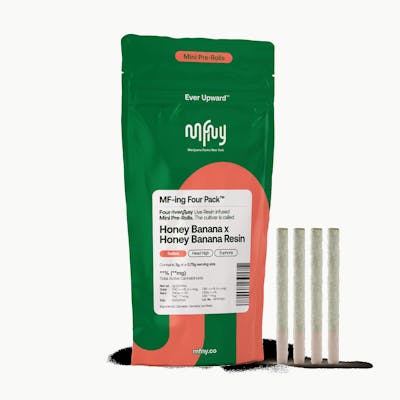 For our resin infused pre-rolls, we start with premium, hand-trimmed whole Honey Banana flower then infuse it with our in-house made Honey Banana live resin HTFSE (High Terpene Full Spectrum Extract from fresh frozen buds). This process creates a higher potency, flavorful product with the best of two cultivars: the enhanced, unmistakable banana aroma of Strawberry Banana balanced with the sweet flavor of Honey Boo. Potent and high in THC, this product is a treat for experienced cannabis consumers. No shake, no trim. Just the very best of our craft cannabis, ready to enjoy. Exclusively single-sourced at MFNY in the Hudson Valley. Four 0.75 G pre rolls | Live Resin Infused | Sativa | Honey Banana X Honey Banana Resin Cannabis flower is the smokable, trichome-covered part of a female cannabis plant. An infused pre-roll has cannabis concentrate like hash, kief, wax, or shatter, placed inside or outside of the pre-roll.