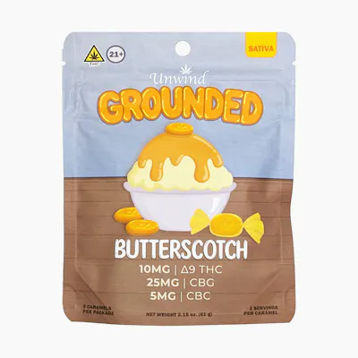Unwind’s Grounded Caramel delivers rich, creamy butterscotch flavor with a hint of nostalgia — perfectly paired with a balanced blend of THC, CBG, and CBC for an easygoing daytime experience. The Grounded caramel is the kind of treat that fits perfectly into your daytime flow — sweet, tasty, and just the right amount of boost. Flavor: Butterscotch Type: Daytime Hybrid Content: 10mg THC + 25mg CBG + 5mg CBC per caramel 2 servings / 5mg THC + 12.5mg CBG + 2.5mg CBC per serving 6 servings / 30mg THC + 75mg CBG + 15mg CBC per package