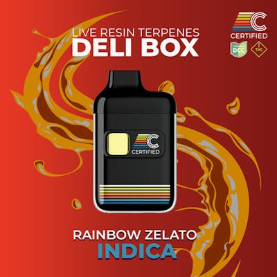 From our LOUD Series, the Deli Box [Variable Voltage] Disposable made with Live Resin Terpenes (LRT)! Indica AROMA: Juicy tropical sweetness from Myrcene and Limonene; Warm brown sugar and citrus sparkle from Terpinolene; Herbaceous gas and pine from Caryophyllene, Alpha-Pinene, and Carene; Earthy cedar and forest floor depth from Humulene and Ocimene. DESCRIPTION: Rainbow Zelato, an indica cross of Original Z and Do-Si-Dos, presents an intricately layered aromatic profile. Leading with Terpinolene and Myrcene, this strain bursts with overripe pineapple and syrupy brown sugar. Limonene injects a bright lemonade twist that lifts the sweet fruit into sharp contrast with deeper notes. As the aroma settles, Ocimene, Caryophyllene, and Alpha-Pinene usher in a wave of herbaceous gas, cool cedar, and coniferous richness. Rounded out by Carene and Humulene, the finish is earthy, dense, and slightly dank. The experience rides a full spectrum from sweet to savory, light to grounded. EFFECTS: A heady and immersive indica that balances tropical sweetness with earthy weight—ideal for winding down without dulling the senses. PRIMARY TERPENE: Caryophyllene | Limonene SECONDARY TERPENES: Humulene | Linalool / a-Pinene | b-Pinene | Farnesene / Myrcene (based on an average of test results; may vary batch-to-batch) ABOUT: These smell loud - they are not discreet. These all-in-one vape pens are designed to create a cannabis-centric experience, with the associated taste and smells. We carefully source high-quality and flavorful Live Resin terpenes to provide classic strains in a convenient vape format. 2 button clicks: Pre-Heat feature 3 button clicks: Variable Voltage (Low: 2.6V; High: 2.8V) 5 button clicks: turn on/off DELI BOX HARDWARE: Packaged in a Cilicon Deli Box Disposable & Rechargeable All-in-One with Variable Voltage. • No Heavy Metals • Equipped with the next-gen ceramic cool-heating technology – DeliFlow™ • Innovative postless design makes it completely metal-free and cotton-free while providing a clear visual into oil level • Consistent vapor production without leaking or clogging • Flavorful & Smooth Hits **USB-C charging**
