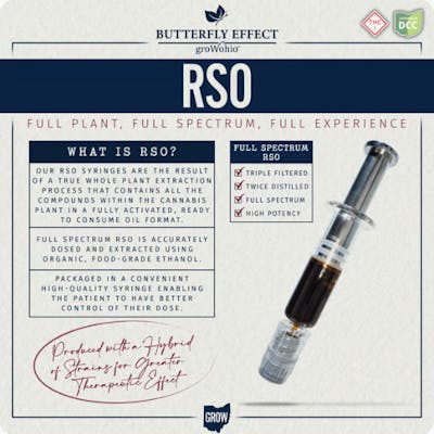 Hybrid Butterfly Effect's RSO syringes are the result of a true whole plant extraction process that contains all the compounds within the cannabis plant in a fully activated, ready-to-consume oil format. Full spectrum RSO is accurately dosed and extracted using organic, food-grade ethanol. Packaged in a convenient high-quality syringe enabling the patient to have better control of their dose.