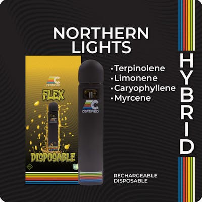 Hybrid AROMA: Herbal citrus punch from Terpinolene; Spiced diesel base from Caryophyllene; Woody dryness from Humulene; Citrus lift from Limonene. DESCRIPTION: Northern Lights offers a bold, grounded aroma that opens with a sharp punch of pine and fuel, driven by very high Terpinolene. Caryophyllene adds a layer of warm spice, while Limonene and Myrcene contribute citrus brightness and musky depth. Beta- and Alpha-Pinene reinforce the pine-forward character, while Ocimene and Carene introduce subtle floral and woodsy notes. Supporting terpenes like Linalool, Terpineol, Bisabolol, and Fenchol soften the finish with delicate herbal and earthy nuances. The result is a powerful, nostalgic aromatic blend that’s sharp, musky, and deeply calming. EFFECTS: A timeless cultivar with piney brightness and earthy spice, driven by an expansive terpene profile. Northern Lights features a soft, hazy onset with deeply grounded aromatics—ideal for evening use and slowing the pace. NEW HARDWARE: Packaged in a CCELL FLEX Disposable & Rechargeable All-in-One. • No Heavy Metals • Inhale Activated • Huge Clouds without Clogging • Flavorful & Smooth Hits **USB-C charging**