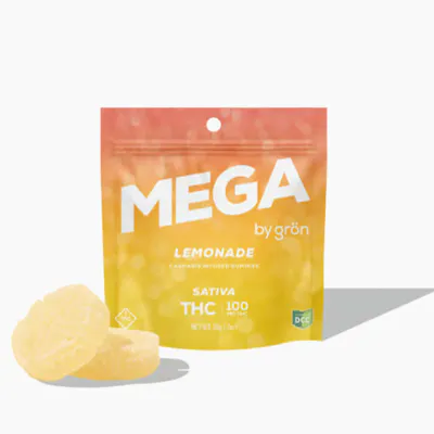 2 MEGAS PER PACKAGE | 50MG PER MEGA 10MG PER SERVING | 10 SERVINGS PER PACKAGE The Lemonade Mega tastes lively and bright. The combination of sunny sativa effects and fresh lemonade flavor are absolutely made for each other.