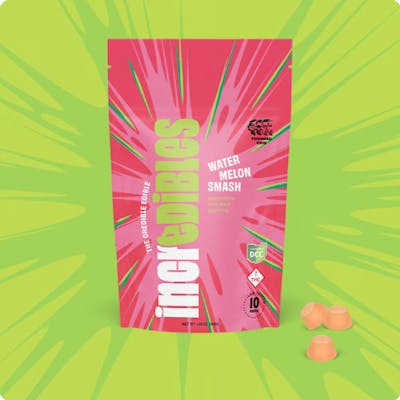 Hybrid Seedless. Clear skies, juicy slices of watermelon, and a picnic spot that is oh-so-fine. Welcome to your happy place. Incredibles Watermelon Smash gummies. Made with pure THC distillate in a homogeneous mixture to ensure accurate dosing and consistency. Potential effects: Invigorating, energetic, uplifting