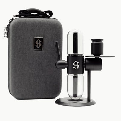 Introducing the newest sensation from Stündenglass, the Kompact Gravity Infuser. The Kompact features the same patented 360° gravity system, dynamic design, and immersive experience as the original, now available in a more refined, portable size that includes a custom-fit travel case. Coming in at just under a foot tall, the Kompact is exactly what you need to enjoy the benefits of Stündenglass in an easy to handle package. The smaller globes hold about two thirds of the volume, or 2 cups, compared to the full size, which creates cooler and faster pulls. The travel case is carefully crafted with high grade fabric and form-fitted to cradle the Kompact Stündenglass, which arrives full assembled. A beautiful metal inlayed logo plate adorns the front with an easy to use zipper, carrying handle and strap for over the shoulder use. Inside, there is space for accessories including a handy pocket to store anything extra you want to bring along with you. Designed for functional versatility, the Kompact Gravity Infuser is a complete set that includes an aluminum bowl kit and a glass liner but can also connect to any smoking or vaporization device with a 14mm male joint. Also included is a 3-foot silicone hose that can be connected to the 45° adjustable mouthpiece for direct draws or a steady stream of smoke for contactless consumption. The Kompact is a sophisticated and elegantly designed 360° rotating glass device that generates kinetic motion activation via cascading water displacement, opposing airflow technology, and the natural force of gravity. It is constructed using the highest quality materials, including borosilicate glass globes and aircraft-grade anodized aluminum.