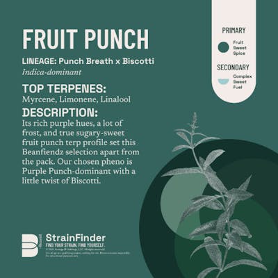 Indica Punch Breath × Biscotti Its rich purple hues, a lot of frost, and true sugary-sweet fruit punch terp profile set this Beanfiendz selection apart from the pack. Our chosen pheno is Purple Punch-dominant with a little twist of Biscotti.