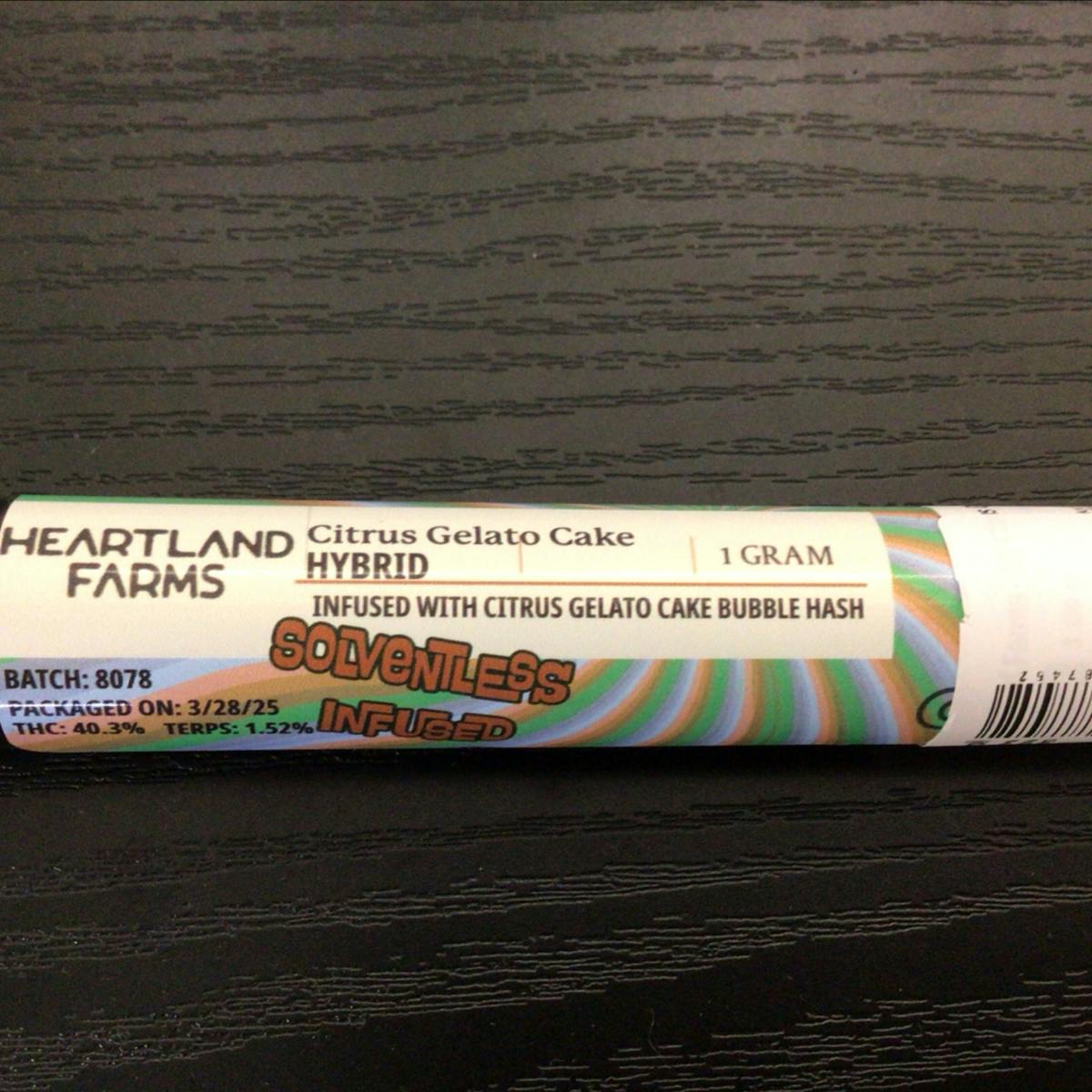 Heartland Farms - 1G Citrus Gelato Cake Bubble Hash Infused Preroll