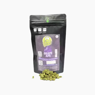 Grape Ape – Deep purple buds with a bold, fruity aroma that’s straight-up grape candy with a touch of earth. Heavy, relaxing body high that melts stress and tension, the kind of strain that makes a couch feel like quicksand—in the best way. Flavors Grape Berry Earthy