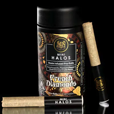 Experience the epitome of sophistication with French Diamonds Mini Halos, a classic coupling of our award-winning FKAFL flower, and our Black Diamond X Live Rosin. A seasoned, lavender-rich inhale offers hints of mint, accompanying a mélange of earthy, diesel undertones that blend into a delicate sweetness. A touch of lemon adds a lovely acidity to this lavish, nuanced smoke, making this a must-try for those who value the finer things in life. Mini Halos bring the elevated experience of our signature rosin-infused pre-rolls into a sleek 5-pack format. The same divine craftsmanship — now in smaller, shareable form. Each half-gram pre-roll is handcrafted with strain-specific indoor flower and infused with .1g of premium live rosin from a complementary cultivar, creating unique, balanced flavor profiles designed for any moment. Whether you’re exploring new pairings or looking for a refined, on-the-go option, Mini Halos deliver the same purity, flavor, and craftsmanship that define the Halo name — in a size that fits every occasion.