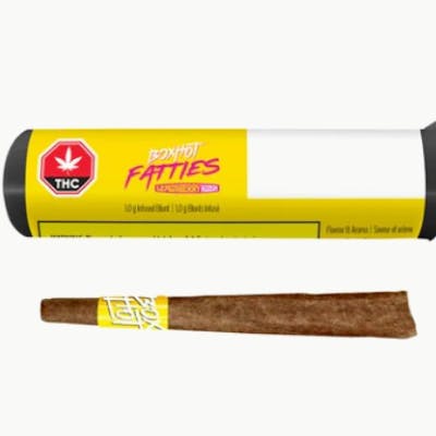 BOXHOT PRESENTS: Lemonberry Kush Fatties, a 1g, indica-dominant pre-roll infused with bold flavour and THC distillate. Enjoy the flavours of sticky cherry and lemon zest. All BOXHOT Fatties feature over 30% THC and 5% botanical terpenes and use slow-burning chamomile wraps for a smooth, consistent blaze.