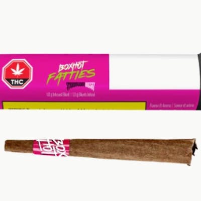 BOXHOT PRESENTS: Strawberry Diesel Fatties, 1g pre-rolls infused with bold flavour and THC distillate. This well-balanced sativa-dominant pre-roll brings delightful strawberry flavours complemented by robust notes of gas. All BOXHOT Fatties feature over 30% THC and 5% botanical terpenes and use slow-burning chamomile wraps for a smooth, consistent blaze.
