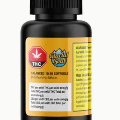 Introducing Balanced 10:10 Softgels 50-pack containing a total of 500mg of THC and 500mg of CBD. Glacial Gold Balanced 10:10 Softgels are made with organic MCT oil from coconuts and high-purity distillates from Nextleaf Labs.