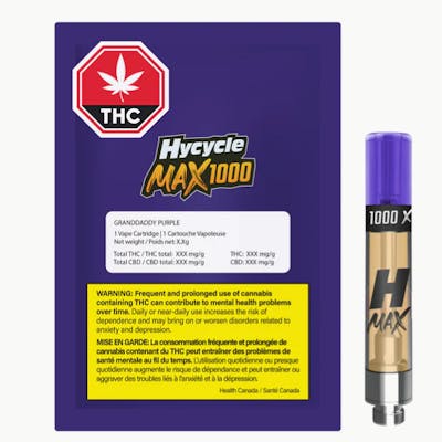 Granddaddy Purple by Hycycle MAX 1000 packs 1.1g of distillate and 1000mg of total THC at 90%+ potency. This iconic indica-dominant cultivar built its name on loud grape and berry flavour with earthy undertones. Made with high-purity distillate, cannabis-derived terpenes and botanical terpenes, it stays true to the classic strain. Powered by premium hardware, every pull hits smooth, consistent, and full of flavor.