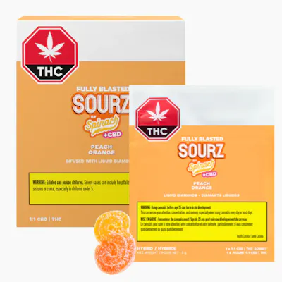 SOURZ by Spinach® Fully Blasted Peach Orange 1:1 CBD | THC Gummies are action-packed with a balanced blend of 10mg THC and 10mg CBD per piece. With the taste of sweet peach and juicy orange, these dual-flavoured gummies are over-the-top with natural flavours and blasted with sour crystals. Enjoy 10 gummies with 10mg THC and 10mg CBD per gummy, 100mg THC total and 100mg CBD total per pack.