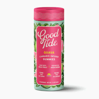Take a tropical plunge with Good Tide guava gummies.Infused with rosin extracted from hybrid cannabis strains, our guava gummies offer a balanced high with true-to-plant properties. The naturally occurring terpenes and minor cannabinoids present in our solventless hash rosin combine with the real- fruit guava ingredients to create a deliciously rounded experience.