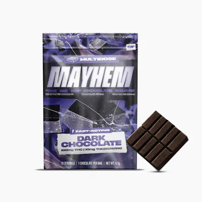 This 1 inch square of real dark chocolate may look compact, but it delivers in full. Rich dark chocolate meets a fast-acting formula, precision cut for accurate dosing. Each square is scored into 10 perfectly dosed 10mg pieces for a total of 100mg. This is not a snack. It is Mayhem in a square. Servings Per Bag: 10 Chocolates Per Pack: 1 THC Per Serving: 10mg Total THC: 100mg THC/Chocolate: 100mg Effects: Euphoric