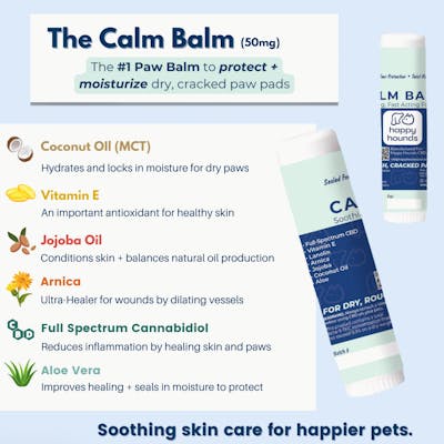 Happy Hounds Calm Balm is made from human-grade ingredients to soothe and moisturize your dog's paws. We combine the nourishing power of Vitamin E, Aloe Vera, Arnica, Coconut and Jojoba Oil in an easy to use roll-on stick to heal their heels. Our enriched paw balm soothes even the toughest dog and cat paws. Whether it's scorching pavement or icy sidewalks, the balm creates a protective barrier to guard against extreme temperatures and environmental irritants. Happy Hounds hydrating formula helps to combat dryness by preventing cracks and discomfort. Moisturizing their paws is essential nourishment to protect against extreme temperatures and environmental irritants like snow, ice, salt, and debris. - The Key Ingredients for Healthier Paws: Vitamin E: An important antioxidant for healthy skin Aloe Vera: Improves healing + seals in moisture to protect paw pads Jojoba Oil: Conditions skin + balances natural oil production Coconut Oil: Hydrates and locks in moisture for dry paws Arnica: Ultra-Healer for wounds by dilating vessels to speed up the healing process Hemp: Calms inflamed skin by healing skin and paws