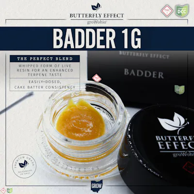 Layer Cake is a compelling strain that delivers an intense gassy and garlicky aroma, immediately grabbing attention with its bold, savory profile. As one of Ohio's favorites, Layer Cake offers the perfect balance of soothing pain relief and a euphoric lift. An ideal introduction into concentrates, Butterfly Effect Badder is the perfect blend, whipped form of live resin for an enhanced terpene taste. Easily dosed, cake batter consistency offering a consistent & repeatable concentrate experience.