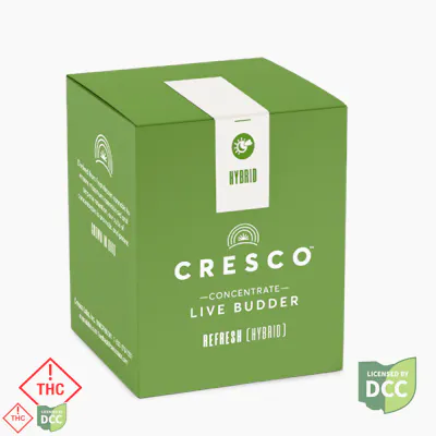 A smooth and creamy concentrate. Derived from fresh frozen cannabis to ensure maximum cannabinoid and terpene retention, our suite of live concentrates is aromatic and potent. Refresh products are derived from a hybrid of sativa and indica strains, which encourage balance and clarity. Refresh strains are good for emerging from afternoon slumps, creative expression, and enjoying me time.