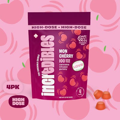 Made with even more love. Sweet and tangy cherry essence, sultry sunshine, and nothing but time to treat yourself. Oh lá lá. Made with 100% pure cannabis oil in a perfectly blended mixture to ensure accurate dosing and consistency. Perfect for reading a good book and jammin' out to some good tunes. Featuring a precision-dosed confection collection with yummy flavors and delicious effects, you can trust incredibles to be the credible edible. Potential effects: Invigorating, energetic, uplifting Serving size: Standard serving is a single gummy (25mg THC). Bag contains four gummies for a total of 100mg THC. Onset & duration: Onset may take up to 2 hours. Duration can last up to 3+ hours. Effects vary by individual. Estimates are based on a standard serving. Contents: Made with pure THC oil and evenly blended for consistency. Allergens: Coconut oil. Made in a facility that processes tree nuts, peanuts, milk, soy, and wheat. Ingredients: Glucose, sugar, gelatin, sorbitol, potato starch, citric acid, natural and artificial flavors, coconut oil, cannabis extract, fruit and vegetable juice (color) Storage: Keep in original sealed container between 60¬∞F - 80¬∞F. Avoid conditions of high humidity and temperature. Keep out of direct light and do not store in hot car. Net Weight: 1.06oz (30g)