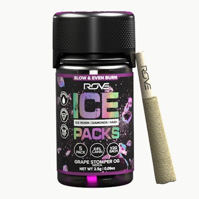 Rove Ice Packs, the world’s first triple-infused preroll. Made with premium-grade flower fully-infused with THCA diamonds and solventless ice hash rosin, they're expertly rolled, then coated with more ice hash. Super smooth and ultra potent, Rove Ice Packs test at over 50% THC. Welcome to the next evolution of prerolls. -- Drift into tranquility with Grape Stomper, a soothing indica preroll that gently merges mind and body. This carefully crafted blend slowly unwinds tension, easing your mind into a dreamy haze. Perfect for when you need to unplug and drift off.