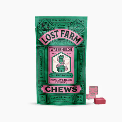 10mg THC per piece | 100mg THC total in 10 pieces Infused with Slurricrasher Live Resin Strain Notes: Expect an exhilarating body high followed by a mellow euphoria with Slurricrasher live resin. This happy hybrid blend of Slurricane and Wedding Crasher features sweet grape and berry notes with a crisp, lemony gas finish. Flavor Notes: Slurricrasher's grape and citrus notes are the foundation for this fruit chew's juicy, melon flavor topped with fresh cucumber notes.