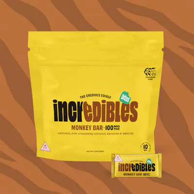 A whole different animal. Milk chocolatey coconut, sweet bananas, and crunchy walnuts. Time to get funky with this monkey. Made with 100% pure cannabis oil in a perfectly blended mixture to ensure accurate dosing and consistency. Perfect for arts and crafts and sweet tooth cravings. Featuring a precision-dosed confection collection with yummy flavors and delicious effects, you can trust incredibles to be the credible edible. Serving size: 10mg THC per individually wrapped bite. Bites can be broken down into 2.5mg THC increments for flexible serving sizes. Bag contains ten bites for 100mg THC total. Onset & duration: Onset may take up to 2 hours. Duration can last up to 3+ hours. Effects vary by individual. Estimates are based on a standard serving. Contents: Made with pure THC oil and evenly blended for consistency. Allergens: Milk, soy, walnuts. Made in a facility that processes tree nuts, peanuts, milk, soy, eggs, coconut and wheat. Ingredients: Milk and dark confectionery coating, walnuts, freeze-dried bananas, palm kernel oil, cannabis extract, natural toasted coconut cream extract Storage: Keep in original sealed container between 60°F - 80°F. Avoid conditions of high humidity and temperature. Keep out of direct light and do not store in hot car. Net Weight: 1.58oz (45g)