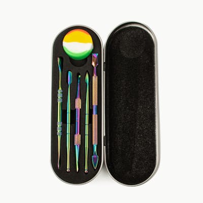 Take your concentrates on the go with this new Anodized Dabber Set from LIT™ Silicone. Includes multiple tools and a handy dab jar for storing concentrates. All of this is stored inside of the metal carrying case that offers a discreet and simple way to bring your dab tools on the road.