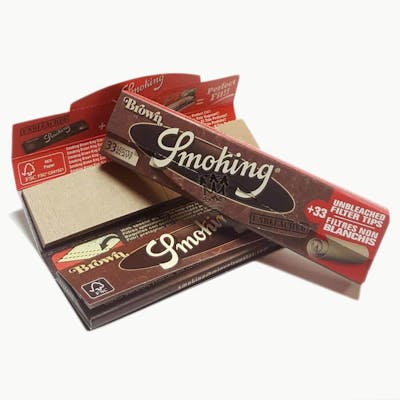 King size papers and tips in one convenient package! Launched in 1924, the Smoking brand has been a world leader in rolling papers for nearly a century. Smoking Brown is the brand's flagship unbleached rolling paper. This ultra-fine, slow burning paper is produced from unbleached, FSC certified, wood pulp, contains no dyes or chlorine, and has an acacia gumline (that sticks!). Made without the use of animal products. Brown one-and-a-quarter contains 50 leaves per booklet. 77 mm x 44 mm. Manufactured in Barcelona, Spain.