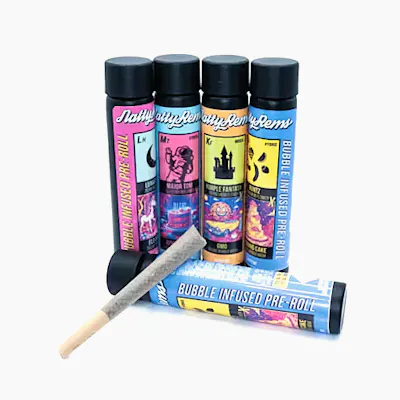 Purple Trainwreck x Sundae Driver Natty Rems bubble hash infused pre-rolls are premium 1 gram joints that combine top-shelf cannabis flower with solventless bubble hash for enhanced potency and flavor.