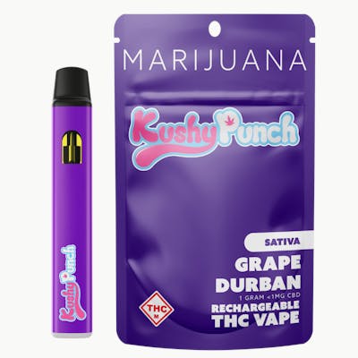 Turn up the vibes with Grape Durban—your go-to sativa when you need a boost of flavor and daytime firepower! This juicy gem blends mouthwatering grape candy notes with the legendary kick of Durban Poison, sparking a heady rush of creativity, focus, and good vibes. Whether you're checking off to-dos or turning up with friends, Grape Durban brings the PUNCH to keep you lit, lifted, and locked in! Why You’ll Love It: - Great-Tasting Flavor: A fruity explosion of grape and durban poison - Premium Cannabis Oil: Pure, potent, and packed with terpenes - Unique Design: Purple, sleek, stylish, and totally Kushy-approved - USB-C Rechargeable: Quick to charge, long-lasting battery life - Clog-Free Innovation: Single-chamber design lets you clear clogs with ease