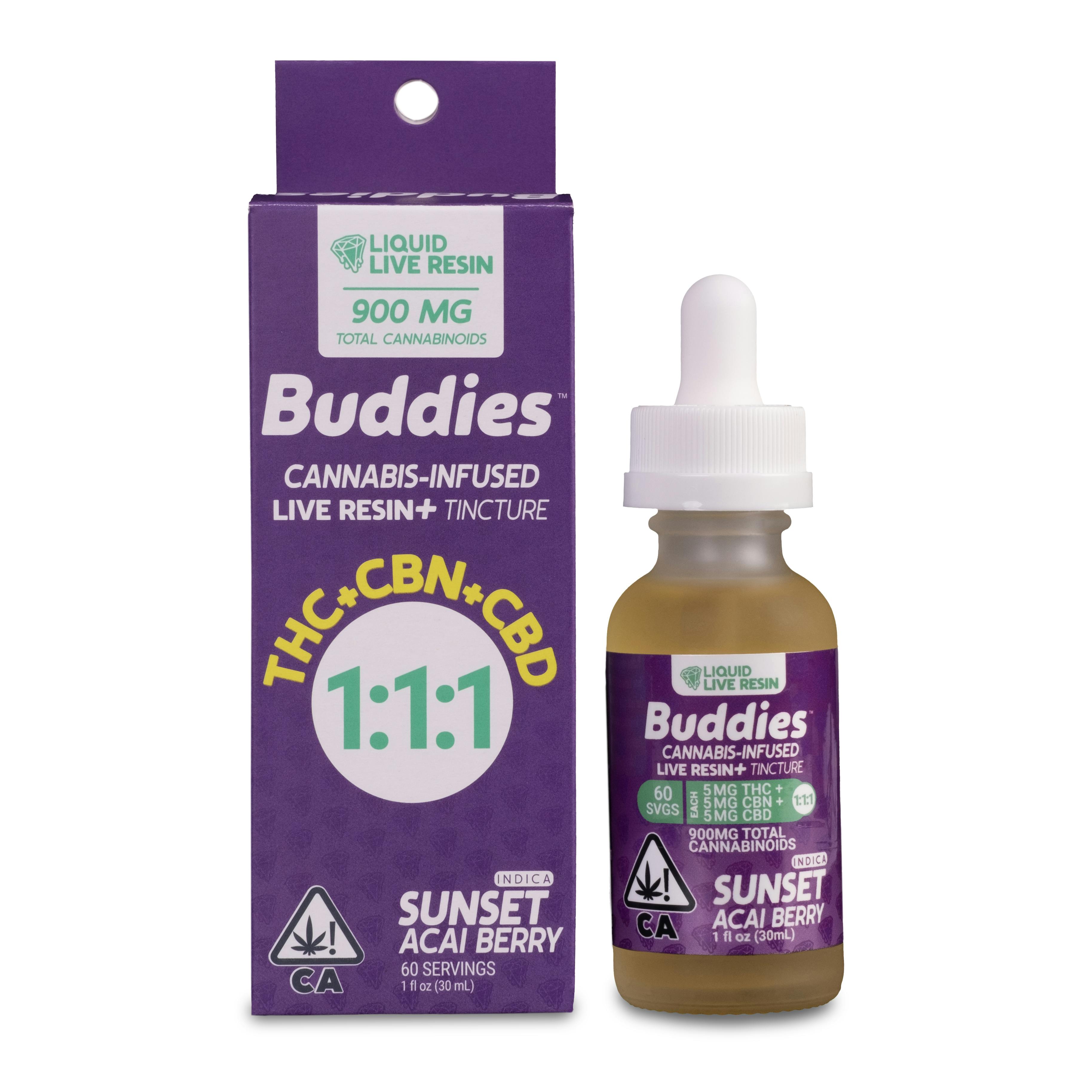 Buddies Sunset Acai Berry 1:1:1 THC CBD CBN Tincture is an INDICA nightcap at Vibe Cannabis built for calm control with a balanced ratio and fast sublingual absorption this INDICA tincture supports relaxed vibes happy ease and sleepy wind down for a steady California cannabis routine