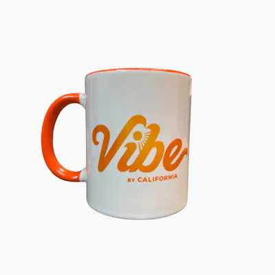 VIBE Coffee Mug White Orange brings dispensary energy to your morning pour a simple grab and sip essential that reps Vibe while you browse California cannabis deals and load your cart at vibecannabis.co
