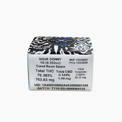 HYBRID | 1g Cured Resin Sauce | Tribe710 THC: 72–84% | Terpenes: Caryophyllene, Limonene, Myrcene Genetics: Sour Diesel x Donny Burger (GMO x Han-Solo Burger) Flavor: Pungent diesel, sour lemon, earthy muskTribe710 Sour Donny is a bold 1g HYBRID cured resin sauce fusing diesel punch with indica depth for serious concentrate fans at Vibe Cannabis California.